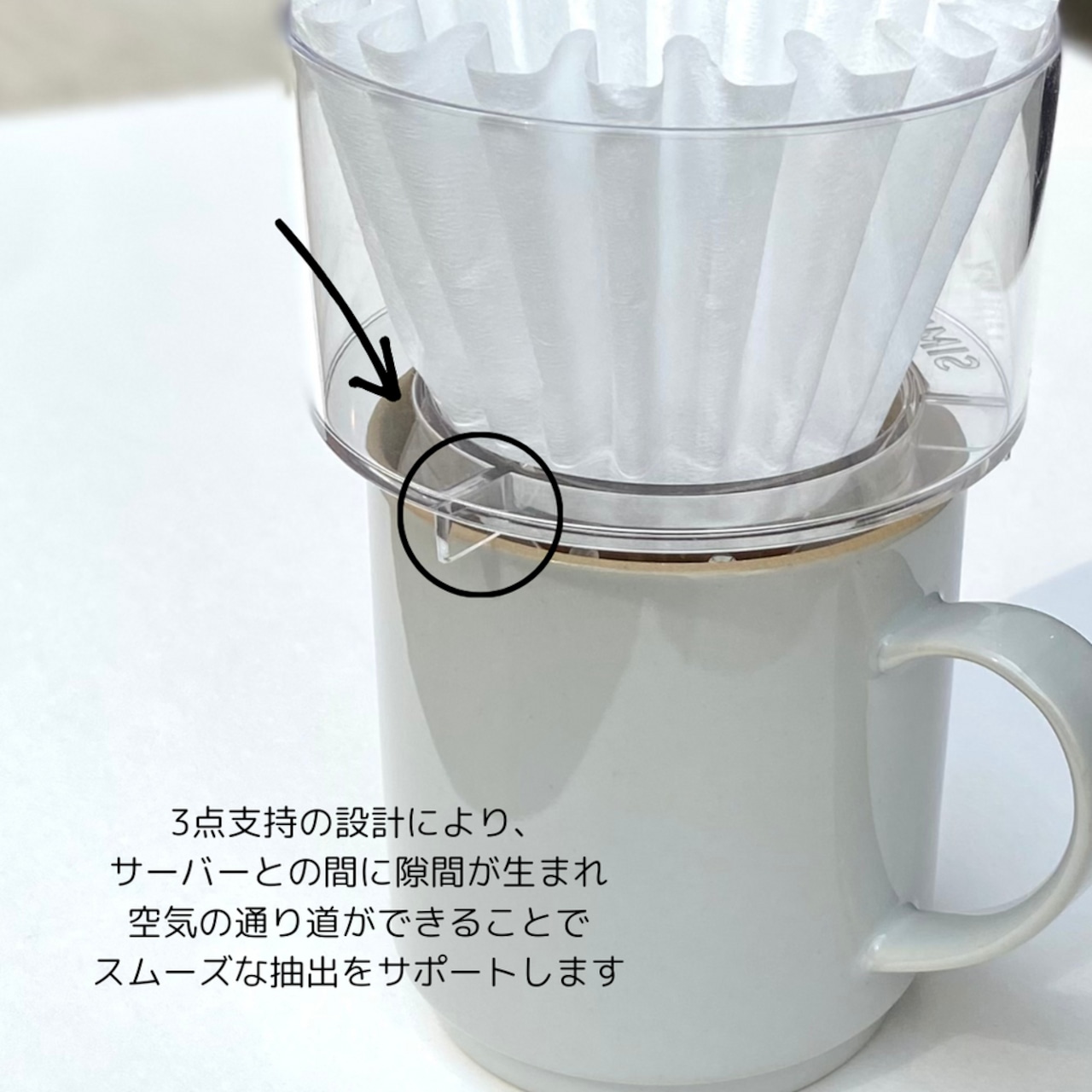 3点支持のデザインにより、サーバーとの間に適度な隙間ができ、空気の流れを確保。お湯がスムーズに落ちる設計。